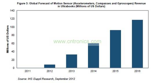 在超級本的帶動下,包括加速計、陀螺儀和羅盤在內(nèi)的運動傳感器的全球銷售額到2016年將達(dá)到1.173億美元,而2012年只有830萬美元,2012-2016年的復(fù)合年度增長率高達(dá)93.9%,如圖所示。