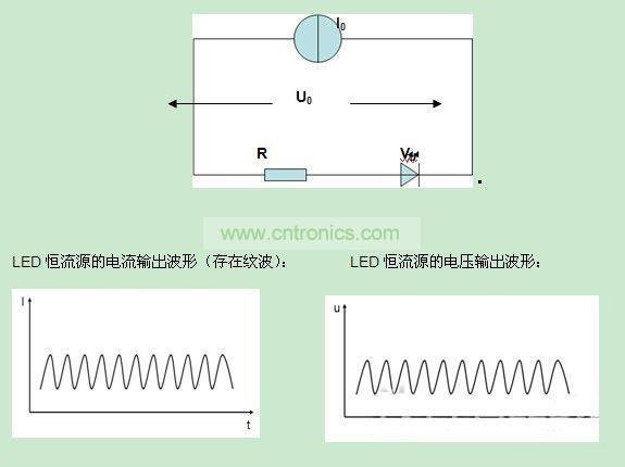 假設(shè)LED驅(qū)動此時輸出的電流值I0為100mA,R=10Ω,二極管導(dǎo)通電壓Vd=30V,那么實(shí)際的LED燈拉載時,LED驅(qū)動的輸出電壓U0=100mA*10Ω+30V=31V,輸出為31V/100mA。假設(shè)恒流源的輸出電流紋波為10mA, LED驅(qū)動的輸出電壓紋波實(shí)為10mA*10Ω=0.1V。