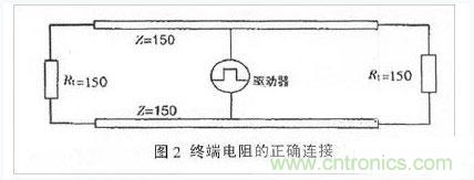 ②阻抗不連續(xù),顧名思義,與光從一種媒質(zhì)進入另一種媒質(zhì)時所引起的反射是相似的。信號在傳輸線末端突然遇到電纜阻抗很小甚至沒有,信號在這個地方就會引起反射。消除這種反射最常用的方法,是在電纜的末端跨接一個與電纜的特性阻抗同樣大小的終端電阻,使電纜的阻抗連續(xù)。由于信號在電纜上的傳輸是雙向的,因此,在通訊電纜的另一端同樣要跨接一個相同大小的終端電阻,如圖2所示。