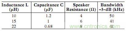 常見(jiàn)的濾波器設(shè)計(jì)選擇目的是為了在所需要的最高音頻頻率條件下將濾波器響應(yīng)下降減至最小以獲得最低帶寬。如果對(duì)于高達(dá)20 kHz頻率,要求下降小于1 dB,則要求典型的濾波器具有40 kHz巴特沃斯(Butterworth)響應(yīng)(以達(dá)到最大平坦通帶)。對(duì)于常見(jiàn)的揚(yáng)聲器阻抗以及標(biāo)準(zhǔn)的L值和C值,下表給出了標(biāo)稱(chēng)元器件值及其相應(yīng)的近似Butterworth響應(yīng):
