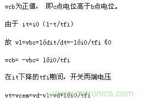 因此,在關(guān)斷過程一開始,vt立即從零上升到vcem,it在從i0下降至零期間,vt=vcem不變。直到it=0、id=i0以后,vt才下降為電源電壓vd,如圖5(b)所示。vcem超過vd的數(shù)值取決于lб、tfi和負(fù)載電流i0,顯然過快的電流下降率di/dt(即tfi?。?、過大的雜散電感l(wèi)б或負(fù)載電流過大都會(huì)引起關(guān)斷時(shí)元件嚴(yán)重過電壓,且伴隨著很大的功耗。