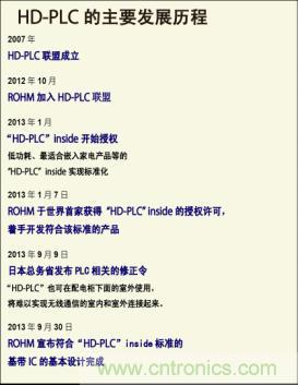 ROHM于2012年10月加入“HD-PLC”聯(lián)盟,并領(lǐng)先于全世界開(kāi)始著手開(kāi)發(fā)符合“HD-PLC” inside標(biāo)準(zhǔn)的基帶IC。