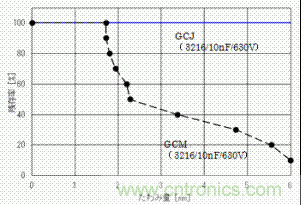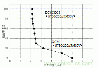 根據(jù)這個(gè)評(píng)價(jià)結(jié)果,于一般用2端子的MLCC(GCM系列)的殘存率的比較如圖7、圖8所示。GCJ、KCM/KC3系列,電路板的偏轉(zhuǎn)量在6mm的時(shí)候也看不見對(duì)陶瓷部分的破壞,于GCM系列相比耐電路板彎曲性有了飛速的改善。