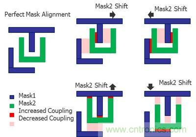 圖2:雙重成像(DP)的光罩可能存在的未對準(zhǔn)情況要求設(shè)計人員評估更多寄生參數(shù)提取的corners,以驗證集成電路的時間選擇和性能。