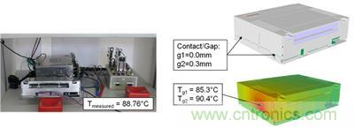 底盤的一部分被用作汽車功放的冷卻散熱片。底盤的一個重要方面在于頂部支架和底蓋的熱接觸程度(關乎制造公差)。對模型假設進行驗證是提高模型精確度的關鍵。這樣可以測量產(chǎn)品原型并利用測量結(jié)果來比較模擬模型。方案1 (g1) 無間隙(完全熱接觸),而方案2(g2) 則存在0.3毫米的間隙,因此蓋子之間沒有熱接觸。通過比較所測量的外殼溫度,方案2(有間隙)似乎最能代表支架的接觸程度。