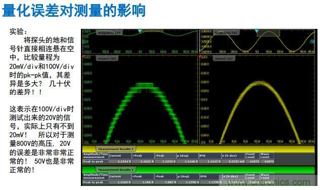 很多人覺(jué)得不可思議,為什么零伏的測(cè)試信號(hào)是30伏呢?就是這個(gè)原因。因?yàn)榘雽?dǎo)體的制作工藝的原因就是這里。當(dāng)100伏/格的時(shí)候,正常測(cè)量的范圍是800伏除以256,最終結(jié)果差不多是30。這個(gè)是高壓測(cè)量的例子。所以平時(shí)用示波器測(cè)量電源的文波的時(shí)候,我們應(yīng)該怎么做?如果是測(cè)量3.3伏的電流波,永遠(yuǎn)要把探頭在地上的帽子拔掉,這個(gè)用短的地環(huán)。如果測(cè)1.8伏以下的電流波,紋波只有3豪伏以下的時(shí)候怎么做?勇敢要把探頭拔掉。為什么?因?yàn)楹芏嗵筋^插上去之后,最小是1毫伏/格,直接就變成了10毫伏/格,你的示波器的量化、噪聲,加上隨機(jī)噪聲,遠(yuǎn)遠(yuǎn)的大于你的被測(cè)信號(hào)的噪聲,測(cè)量的結(jié)果就失去意義了。所以我們講的第一個(gè)原則就是量化最小測(cè)量誤差。