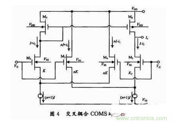 本文采用經(jīng)典的交叉耦合差動(dòng)式COMS跨導(dǎo)器,其I/V傳輸特性有理想的線(xiàn)性關(guān)系。圖4中,M1和M2偏置電流為I;M3和M4偏置電流為 nI。電路設(shè)計(jì)中,M1~M4有相同的溝道長(zhǎng)度L,M3,M4的溝道寬度W=nL。設(shè)Y1=i1/I,Y2=i2/I,X=Vid/Vb,則: