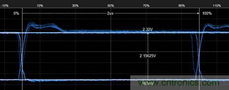 4. 然后再測量bit后半段的最大幅值,如圖5所示,為2.25V。則2.25÷2.15=104%,符合GMW3122信號特征標(biāo)準(zhǔn)。