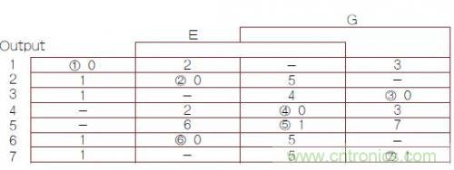 圖2:異步有限狀態(tài)機(jī)(FSM)轉(zhuǎn)換主表,其中1,2,3,4,5,6,7帶圈的數(shù)字是穩(wěn)定FSM狀態(tài)號(hào)(G是時(shí)鐘輸入)。