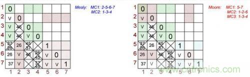 圖3:根據(jù)Mealy(左)和Moore(右)狀態(tài)機(jī)做出的最終表格對(duì)。