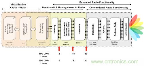 射頻單元位于緊鄰塔頂天線的位置,以避免功率損耗。這些遠(yuǎn)端射頻單元通過(guò)光纖連接至基帶 BTS 機(jī)架。制定的通用公共無(wú)線接口(CPRI) 協(xié)議用來(lái)傳輸數(shù)據(jù)和同步遠(yuǎn)端射頻。在有些無(wú)法使用光纖的情況下,使用微波或毫米波無(wú)線電來(lái)傳送 CPRI 有效負(fù)載。這種架構(gòu)轉(zhuǎn)變使運(yùn)營(yíng)商有望能夠混合使用和匹配來(lái)自不同系統(tǒng)廠商的無(wú)線電和基帶機(jī)架,以降低成本,改善供應(yīng)鏈,以及簡(jiǎn)化庫(kù)存管理。然而互操作性問(wèn)題讓這種希望化為了泡影,不過(guò)為一級(jí)系統(tǒng)廠商開(kāi)啟了新方法,使其能夠利用來(lái)自小廠商的無(wú)線電設(shè)備來(lái)控制針對(duì)不同地區(qū)的無(wú)線電設(shè)備種類(lèi)的快速增長(zhǎng)。