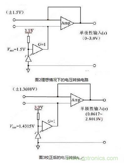 在實(shí)際應(yīng)用中,所采集的信號經(jīng)常為雙極型信號,因此信號在送至ADC之前需要添加轉(zhuǎn)換電路,將雙極型信號轉(zhuǎn)化為單極型信號。典型的轉(zhuǎn)換電路如圖2所示。對于ADC模塊,考慮到增益誤差和失調(diào)誤差對輸入范圍的影響,轉(zhuǎn)換電路需要調(diào)整為如圖3所示的電路。在圖3中,輸入增益誤差的參考范圍已經(jīng)改變。