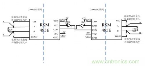 圖 3 簡(jiǎn)易隔離RS485中繼器方案二