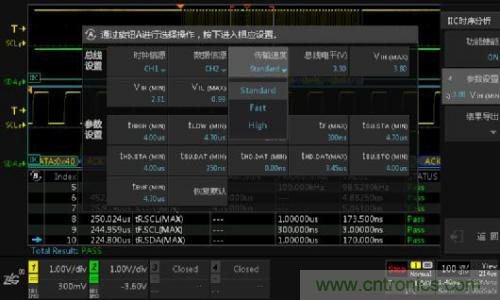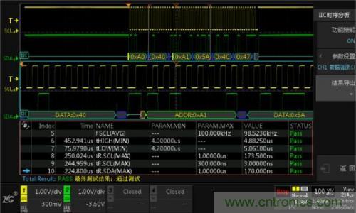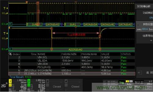 使用I2C時序分析軟件,它能夠在極短的時間內(nèi)完成總線信號的DC特性和AC特性分析,并與器件手冊標(biāo)稱參數(shù)做對比,直接輸出測試結(jié)果(Pass/Fail),同時支持報表導(dǎo)出,省去人工錄入數(shù)據(jù)的煩惱,極大的提升測試效率。具體測試界面如下圖4所示。
