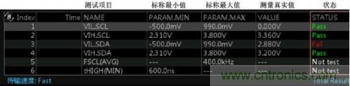 l通過觀察測試表中的測量參數(shù),若所測量的參數(shù)符合測試標(biāo)準(zhǔn)則通過測試,顯示為“Pass”;