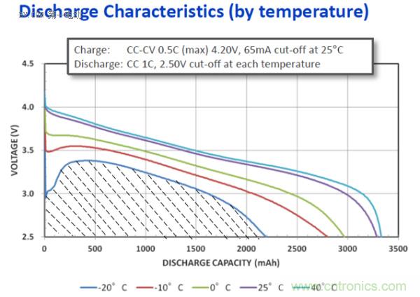 容量測(cè)試Output:溫度與容量(能量)關(guān)系表。以時(shí)間T為X軸,以電壓V為Y軸。不同溫度下1C放電截止在X軸上的點(diǎn)為容量與溫度的關(guān)系。而各個(gè)放電曲線(xiàn)與X、Y軸形成的面積之比就是不同溫度下的可用能量之比。如下圖所示:-20℃時(shí)的電池可用能量(Wh) = 陰影部分的面積S。由此可見(jiàn),SOE比SOC能更加準(zhǔn)確的表示出剩余的能量,從而更準(zhǔn)確的評(píng)估剩余里程。