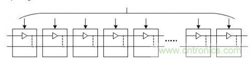 圖 1給出一個預定數(shù)量的延遲單元構成的延遲線電路和通過配置字實現(xiàn)的反饋通道(Dfb)的示例,通過延遲配置字,可以在Din引腳輸入信號和Dout引腳輸出信號之間設定所需 延時。每個延遲單元在Din和Dl兩個引腳之間生成固定的通道延時。