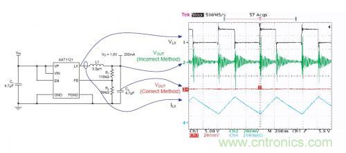 下圖描述了采用兩個(gè)不同的測(cè)試方法得到的Vout波形。電源電路是一個(gè)BUCK轉(zhuǎn)換電路(AAT1121),工作在1.5MHz的開(kāi)關(guān)頻率,輸出電壓為1.8V/250mA。示波器采用全帶寬測(cè)試。可以看到伴隨著PWM開(kāi)關(guān),在綠色的trace2有一個(gè)很高的噪音以及振鈴,但是trace3上卻沒(méi)有明顯的噪聲。通過(guò)對(duì)比可以看到,測(cè)試方法的選擇對(duì)結(jié)果的準(zhǔn)確性很關(guān)鍵。