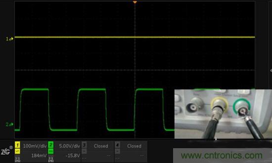 1. 通道1探頭地使用鱷魚夾接地,通道2關(guān)閉(證明通道1信號原狀,見圖2)