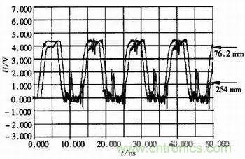 在高速數(shù)字電路的設(shè)計中,除了阻抗匹配外,部分器件對傳輸線的長度有著嚴格的要求,信號頻率越高,要求傳輸線的長度越短。以X1器件和X2器件為例建立仿真模型如圖3所示。在仿真模型中加了33Ω的匹配電阻,選擇仿真信號頻率為66MHz方波,改變傳輸線長度分別為76.2mm和254mm時進行仿真。仿真結(jié)果如圖4所示。