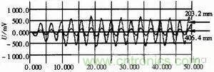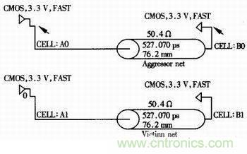 由于頻率的提高,傳輸線之間的串擾明顯增大,對信號完整性也有很大的影響,可以通過仿真來預測、模擬,并采取措施加以改善。以CMOS信號為例建立仿真模型,如圖6所示。在仿真時設(shè)置干擾信號的頻率為66MHz的方波,被干擾者設(shè)置為零電平輸入,通過調(diào)整兩根線的間距和兩線之間平行走線的長度來觀察被干擾者接收端的波形。仿真結(jié)果如圖7,分別為間距是203.2mm、406。4mm時的波形。
