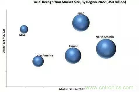 據(jù)Yole數(shù)據(jù)顯示,全球人臉識(shí)別市場(chǎng)規(guī)模預(yù)計(jì)將從2017年的40.5億美元增長(zhǎng)至2022年的77.6億美元,這期間的復(fù)合年增長(zhǎng)率可達(dá)13.9%。推動(dòng)市場(chǎng)增長(zhǎng)的主要因素包括:iPhone X帶動(dòng)更多智能手機(jī)集成3D人臉識(shí)別,公共場(chǎng)所日益增長(zhǎng)的監(jiān)控需求,以及政府部門等各個(gè)產(chǎn)業(yè)對(duì)人臉識(shí)別技術(shù)的應(yīng)用增長(zhǎng)。