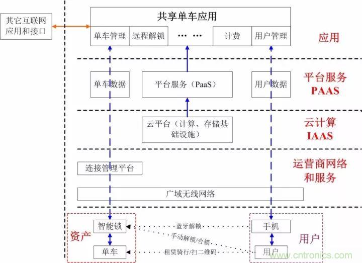云端的共享單車應(yīng)用系統(tǒng)集成外部的互聯(lián)網(wǎng)功能(例如支付、二維碼應(yīng)用、電子地圖等),將單車和用戶連接起來(lái),完成一套完整的租賃服務(wù)流程(地圖尋車-二維掃碼-用戶解鎖-騎行使用-合鎖還車-支付結(jié)算)。