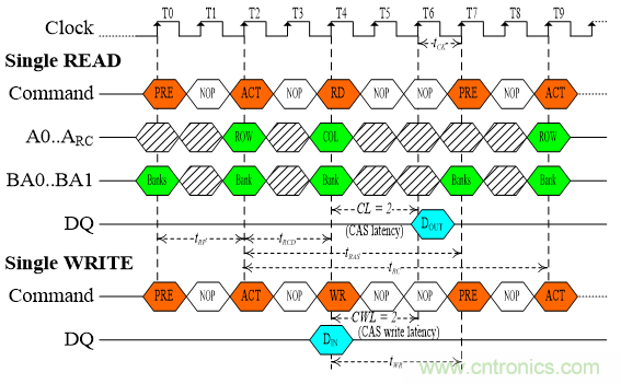 圖中,頻率時(shí)間(tCK)是從此次頻率邊緣至下次頻率邊緣為止的時(shí)間。列地址選通預(yù)充電時(shí)間(tRP)是從PRE命令至ACT命令為止的時(shí)間。列地址選通至行地址選通延遲(tRCD)是從ACT命令至RD命令或WR命令為止的時(shí)間。行地址選通潛伏(CL)是從RD命令開(kāi)始等候一段時(shí)間,并且以tCK為基本單位,然后乘上倍數(shù)。寫入時(shí)間(tWR)是從WR命令至PRE命令為止的時(shí)間;另外還可以tCK為基本單位,然后乘上倍數(shù),如同行地址選通潛伏的計(jì)時(shí)方法,因此命名為行地址選通寫入潛伏(CWL)。列地址選通時(shí)間(tRAS)是從ACT命令至PRE命令為止的時(shí)間。更新命令時(shí)期(tRC)是從這次ACT命令至下次ACT命令為止的時(shí)間。