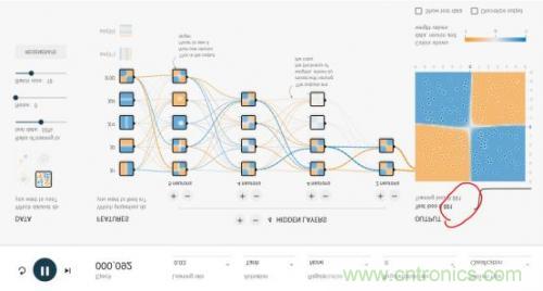整個網絡的輸入層是FEATURES(待解決問題的特征),例如x1和x2表示垂直或者水平切分來劃分藍色與黃色點,這是最容易理解的2種劃分點的方法。其余5種其實不太容易想到,這也是傳統(tǒng)的專家系統(tǒng)才需要的,實際上,這個游樂場就是為了演示,1、好的神經網絡只用最基本的x1,x2這樣的輸入層FEATURES就可以完美的實現(xiàn);2、即使有很多種輸入特征,我們其實并不清楚誰的權重最高,但好的神經網絡會解決掉這個問題。