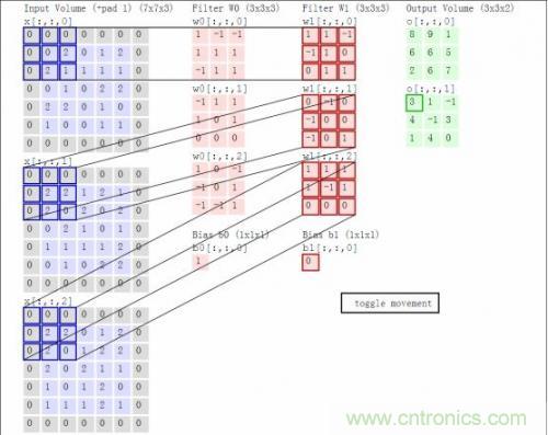 這里卷積核大小與移動的步長stride、輸出深度決定了下一層網絡的大小。同時,核大小與stride步長在導致上一層矩陣不夠大時,需要用padding來補0(如上圖灰色的0)。以上就叫做卷積運算,這樣的一層神經元稱為卷積層。上圖中W0和W1表示深度為2。
