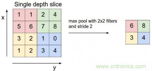 CNN中還有一個池化層,當某一層輸出的數據量過大時,通過池化層可以對數據降維,在保持住特征的情況下減少數據量,例如下面的4*4矩陣通過取最大值降維到2*2矩陣: