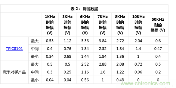 圖 2 顯示了表 1 中的結果。 噪聲等級 () 在兩個器件之間大概是相同的,因為遠離中心頻率的振幅基本相同。 在中心頻率,TPIC8101 具有更高的振幅,這意味著其 SNR 要優(yōu)于競爭產品。