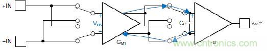 斬波零漂移放大器的內(nèi)部結(jié)構(gòu)可以具有與連續(xù)時間放大器一樣多的級數(shù)——主要區(qū)別在于第一級的輸入和輸出具有一組開關(guān),用于在每個校準周期內(nèi)反轉(zhuǎn)輸入信號。圖3顯示了前半個周期。在前半周期,兩組開關(guān)都配置為翻轉(zhuǎn)輸入信號兩次,但失調(diào)翻轉(zhuǎn)一次。這使輸入信號保持同相,但失調(diào)誤差極性相反。