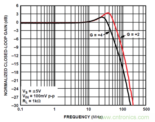 圖 1 所示增益可選放大器采用了一種創(chuàng)新的開關技術,可以保持 ADA4896-2 的 1 nV/√Hz噪聲性能,同時降低非線性增益誤差。利用這種技術,用戶可以選擇電容最小的開關來使電路的帶寬最大化。