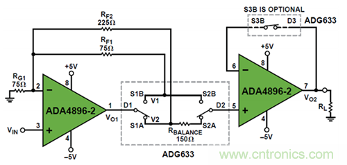 圖 1. 利用 ADA4896-2 和 ADG633 構建低噪聲增益可選放大器來驅(qū)動低阻負載
