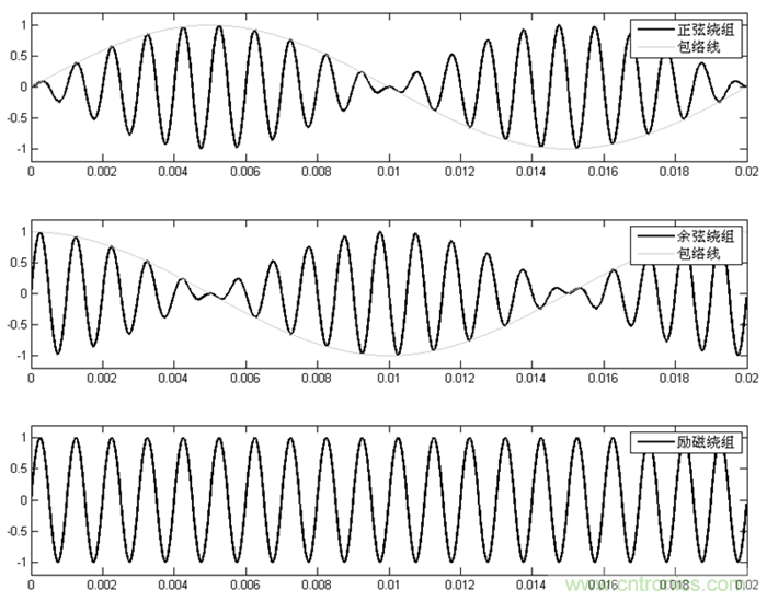正弦繞組和余弦繞組輸出為調(diào)幅波,其包絡(luò)線分別為正弦波和余弦波,包絡(luò)線的頻率為50Hz,對(duì)應(yīng)轉(zhuǎn)子的轉(zhuǎn)速,正弦繞組和余弦繞組的幅值的比值的反正切就是轉(zhuǎn)子的轉(zhuǎn)角。