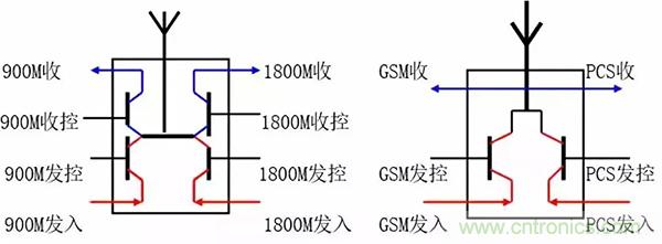 由于手機(jī)工作時(shí)接收和發(fā)射不能同時(shí)在一個(gè)時(shí)隙工作(即接收時(shí)不發(fā)射,發(fā)射時(shí)不接收)。因此后期新型手機(jī)把接收通路的兩開(kāi)關(guān)去掉,只留兩個(gè)發(fā)射轉(zhuǎn)換開(kāi)關(guān);接收切換任務(wù)交由高放管完成。