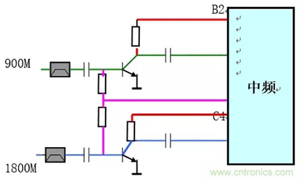 原理:a)、供電:900M/1800M兩個(gè)高放管的基極偏壓共用一路,由中頻同時(shí)路提供;而兩管的集電極的偏壓由中頻CPU根據(jù)手機(jī)的接收狀態(tài)命令中頻分兩路送出;其目的完成900M/1800M接收信號(hào)切換。