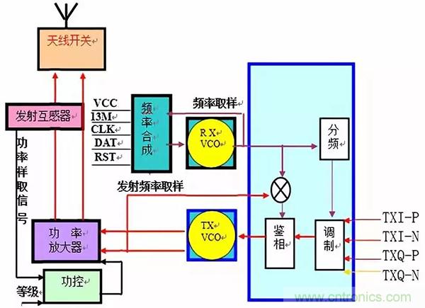 從上看出:由TX-VCO產(chǎn)生頻率到取樣送回中頻內(nèi)部,再產(chǎn)生電壓去控制TX-VCO工作;剛好形成一個(gè)閉合環(huán)路,且是控制頻率相位的,因此該電路也稱(chēng)發(fā)射鎖相環(huán)電路。