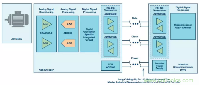 圖1顯示了一個(gè)電機(jī)控制信號(hào)鏈,其利用RS-485收發(fā)器和微處理器連接絕對(duì)編碼器(ABS編碼器)從機(jī)和工業(yè)伺服驅(qū)動(dòng)器主機(jī),以實(shí)現(xiàn)對(duì)交流電機(jī)的閉環(huán)控制。