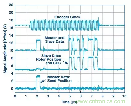 圖6顯示了EnDat系統(tǒng)的測(cè)試結(jié)果。測(cè)試使用的時(shí)鐘頻率為8 MHz,延遲補(bǔ)償通過(guò)接收時(shí)鐘相移實(shí)現(xiàn)。底部信號(hào)是來(lái)自EnDat主機(jī)的命令。此處顯示的命令為“發(fā)送位置”,其前面是兩個(gè)0,接著是六個(gè)1,最后又是兩個(gè)0。該命令總共有10位。編碼器的響應(yīng)是從頂部起的第三個(gè)信號(hào)。合并數(shù)據(jù)線是從頂部起的第二個(gè)信號(hào)。最后,頂部信號(hào)是施加于編碼器的時(shí)鐘。