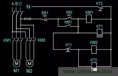 各個(gè)引腳的含義我們已經(jīng)搞清楚了,下面就可以根據(jù)控制原因進(jìn)行接線,我們以下圖為例,在電路中加入KT通電延時(shí)時(shí)間繼電器,當(dāng)按下啟動(dòng)按鈕SB2線圈KT1、KM1得電交流接觸器KM1吸合,電動(dòng)機(jī)M1轉(zhuǎn)動(dòng),延時(shí)閉合開關(guān)KT1到達(dá)時(shí)間吸合,KM2、KT2得電,交流接觸器KM2得電吸合,電動(dòng)機(jī)M2轉(zhuǎn)動(dòng),延時(shí)斷開開關(guān)KT2在到達(dá)時(shí)間以后斷開,整個(gè)控制回路斷開,所有電機(jī)停止轉(zhuǎn)動(dòng);