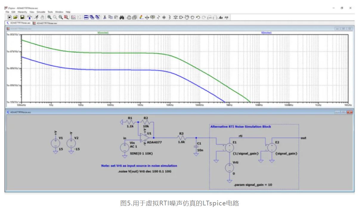LTspice的多功能性和準確性使其對噪聲仿真非常有用。輸出節(jié)點和輸入源在噪聲仿真命令中指定,輸出噪聲(RTO)是查看分析結(jié)果的默認方式。LTspice還會根據(jù)RTI的傳統(tǒng)定義計算參考到指定輸入源的輸入噪聲,但如圖4所示,對傳統(tǒng)RTI噪聲進行積分無法提供有意義的結(jié)果。圖5顯示了如何在LTspice的輸出中添加一級,以便仿真器返回替代的虛擬RTI噪聲。運行仿真后,在選定圖形的情況下,從Plot Settings—Add Trace將輸入噪聲添加到圖形中,然后選擇V(inoise)。這會將輸入噪聲添加到圖形中。曲線形狀與輸出噪聲相匹配,表明整個電路的頻率響應都得到了考慮。在按住ctrl鍵的同時左鍵單擊圖形中標題為"V(inoise)"的曲線,以對總RTI噪聲進行積分。