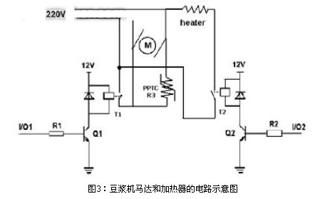 下圖3為多功能豆?jié){機(jī)馬達(dá)和加熱器的簡單電路示意圖。豆?jié){機(jī)所用馬達(dá)為220V直流馬達(dá),繼電器的工作電壓為12V,豆?jié){機(jī)利用繼電器把MCU發(fā)出的低壓控制信號I/O來控制交流高壓信號的通斷,R3為PPTC可恢復(fù)電阻,T1和T2為繼電器。