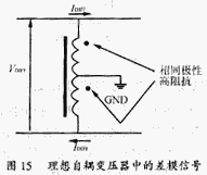 從差模信號(hào)看,有中心抽頭的自耦變壓器是兩個(gè)在相位上相同的對(duì)分繞組,見圖15。這就意味差模電流在其中所形成的磁場(chǎng),會(huì)使其對(duì)差模電流呈現(xiàn)高阻抗。相當(dāng)于對(duì)差模信號(hào)并聯(lián)了一個(gè)高阻值的阻抗,它對(duì)差模信號(hào)的大小沒有影響。