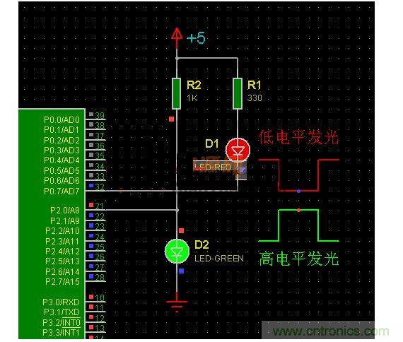 圖1中的D1、D2就可以不經(jīng)其它驅(qū)動(dòng)器件,直接由單片機(jī)的引腳控制發(fā)光顯示。雖然引腳已經(jīng)可以直接驅(qū)動(dòng)LED發(fā)光,但還是看看AT89C51單片機(jī)引腳的輸出能力吧。