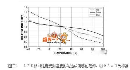 這類LED光源的簡單開迴路架構(gòu)方式有個(gè)潛在的問題,由于LED的光學(xué)特性會受到運(yùn)作條件的影響,因此組合后的RGB光源輸出的亮度以及色度都會變化。同時(shí),每顆LED元件也不盡相同,因此造成RGB光源的輸出產(chǎn)生更多變化,(圖二)與(圖三)就描述了幾個(gè)LED變動的范例。