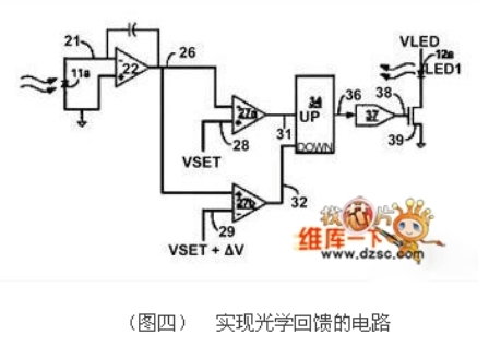 在(圖四)中,標(biāo)記為22的積分電路可以輸出一個(gè)受到光二極管(11a)上光量控制的電壓,這個(gè)電壓與VSET比較,比較器的輸出能控制計(jì)數(shù)器數(shù)值的增加或減少,計(jì)數(shù)器的輸出則是用來推動一個(gè)數(shù)字模擬轉(zhuǎn)換器(37),進(jìn)而控制LED的驅(qū)動電流。