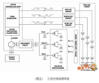 另一個(gè)更先進(jìn)的光學(xué)反饋方式則是采用三色光感測器,通常包含三個(gè)獨(dú)立的光感測器以及上方的三色濾鏡,讓這類光感測器能夠記錄色彩資訊而不只是亮度,這將可以進(jìn)一步控制紅、綠與藍(lán)光LED的發(fā)光強(qiáng)度比,這個(gè)功能相當(dāng)關(guān)鍵,因?yàn)樗專遥牵鹿庠吹牧炼扰c色度得以控制,而ASSP則在三色光學(xué)反饋設(shè)計(jì)上扮演了重要的角色。