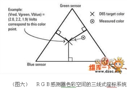基本上來說,三色光感測器會產(chǎn)生一個(gè)三維色彩規(guī)格系統(tǒng),因此稱為RGB感測器色彩空間,這個(gè)系統(tǒng)可以讓特定色彩由感測器的輸出電壓來指定,例如具備特定亮度的D65白光可以記錄為:(Vred, Vgreen, Vblue)=(2.0,?。玻?, 1.9)volts。
